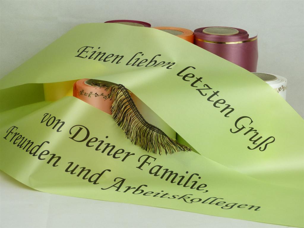 Schleifenbänder mit individuellem Aufdruck in schwarzer Schrift die maximale Zeichenanzahl pro Zeile beträgt 40 Zeichen. Die Schleifen gibt es in den Breiten 75mm, 100mm, 125mm und 150mm. In den Farben weiß, creme und hellgrün. Die Schleifen sind ab einer Breite von 100mm mit Fransen versehen. Die Schleifen bestehen immer aus 2 Bändern (bzw.Flügeln).