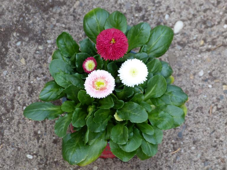 Bellis in 3 Farben rot, weiß und Erdbeersahne in einem 12er Topf. Wir liefern die Trio-Bellis in einer 8er Palletino. (Pflanzenpass)